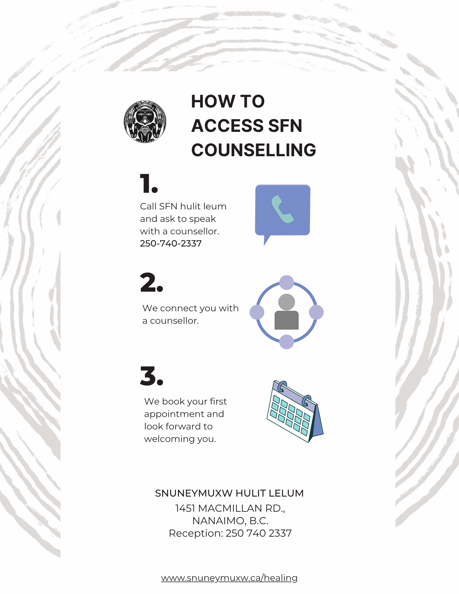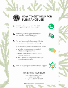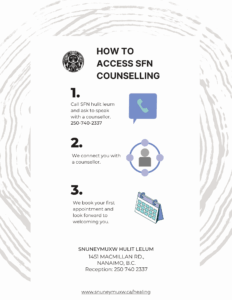 1. Call SFN hulit lelum and ask to speak with one of our counsellors at 250-740-2337